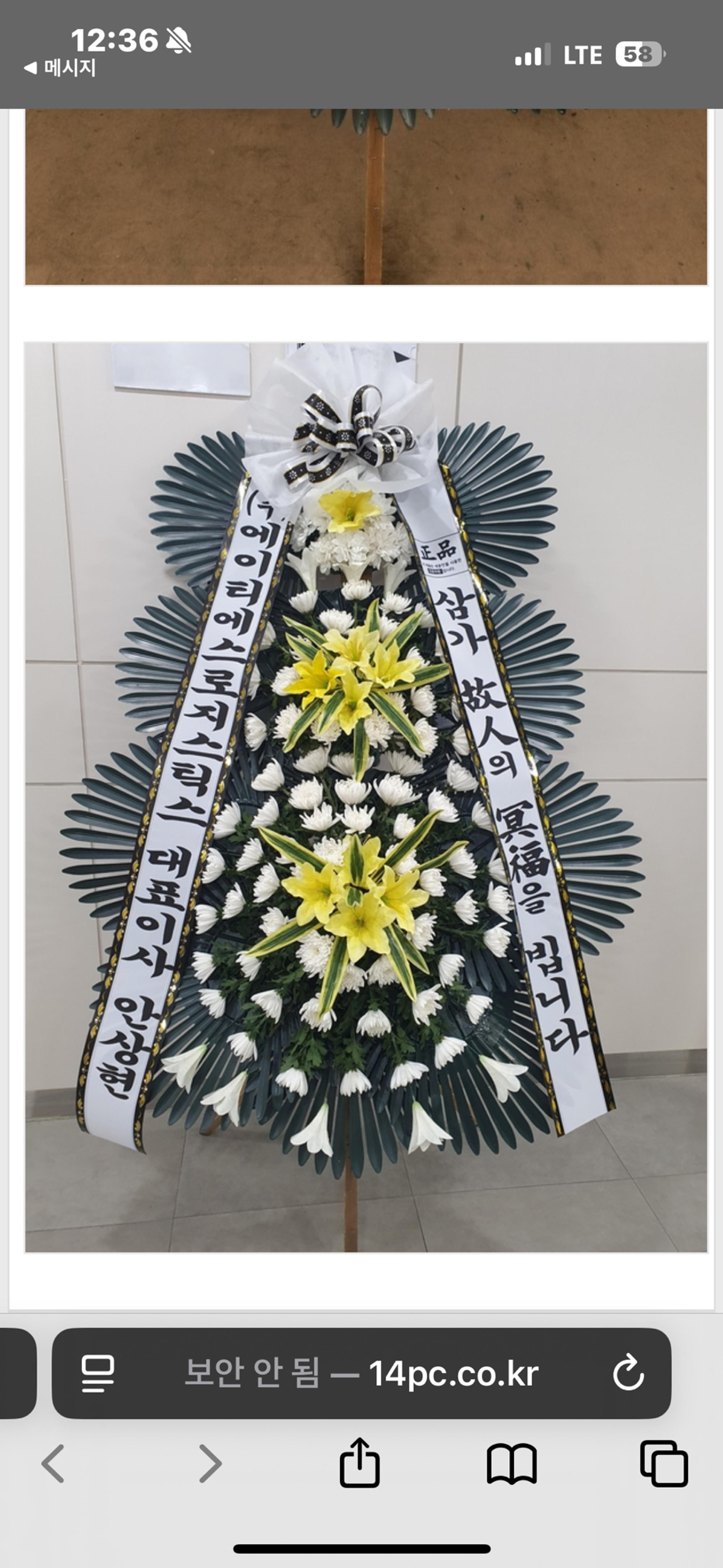 다른 분들 사진보면서 구매에 도움을 받았기에 저도 사진 후기 올립니다. 이곳에서 처음 구매했고 다른 곳보다 가격이 합리적인데 사진이 괜찮아보여서 반신반의하면서 주문했습니다. 배송지와 리본문구 확인 전화주셨고 주문이 많아 배송이 늦을거라 양해해달라고 하셨는데 생각보다 일찍 도착했던 것 같습니다. 한 3시간 정도요. 도착된 화환사진도 잘 보내주셨고 상태도 괜찮아 보여 만족스럽습니다. 근조화환 보낼 일은 더 없었으면 좋겠지만 축하화환이든 보낼 일이 생기면 또 오겠습니다.