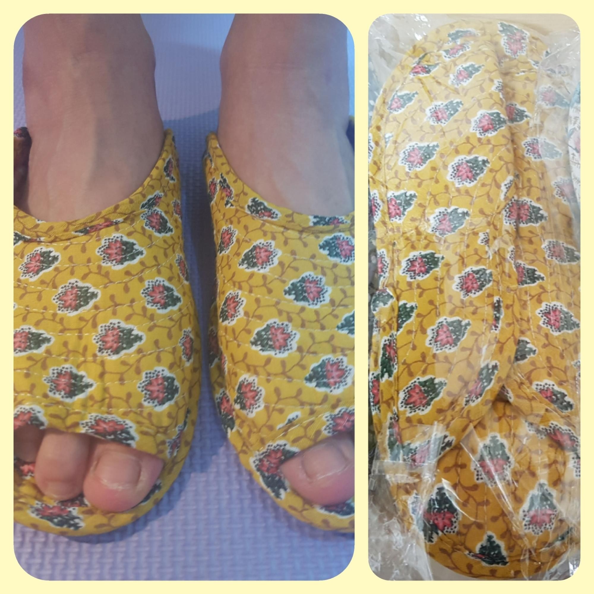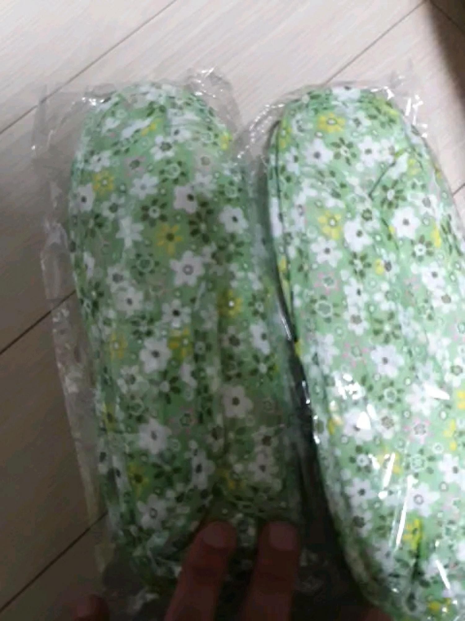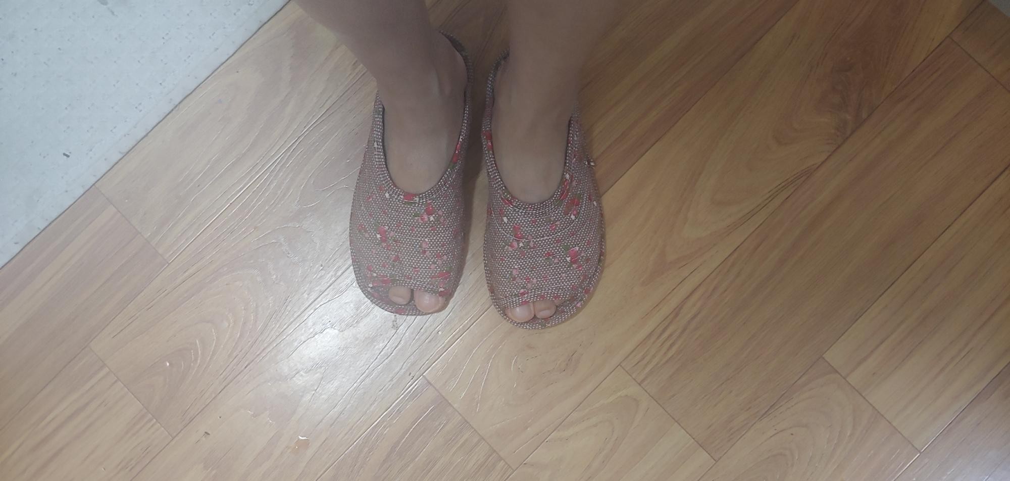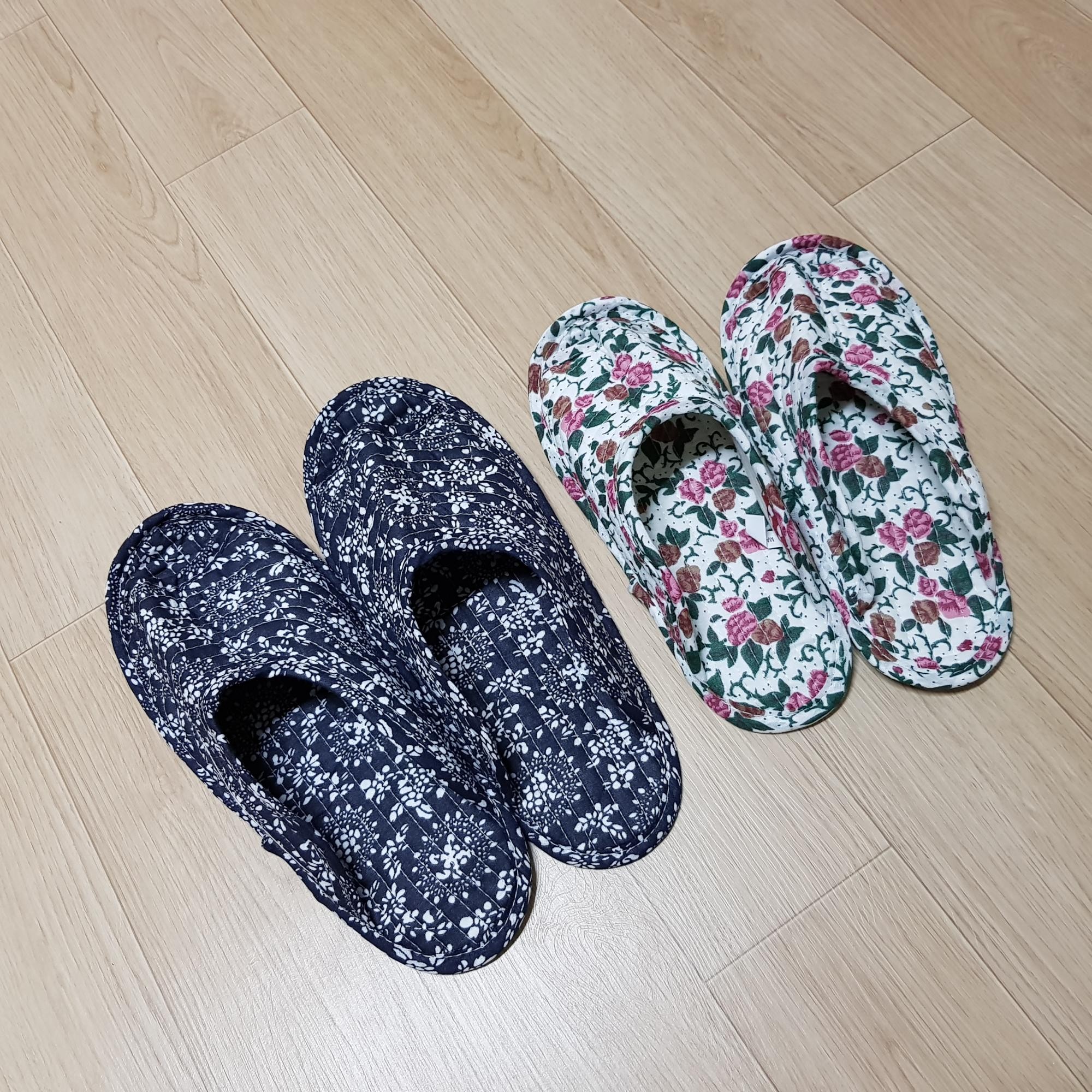 히히 생각했던 그대로에요 패턴 넘귀엽구 남편꺼는 네이비플라워 제껀 화이트에 핑크꽃했는데 너무이뽀요 한가지 아쉬운건 헝겊이라 신을때 고정되질않아 조금 불편하지만 그것만빼면 가볍구 부드럽고 아주아주 대만족입니당ㅋㅋ