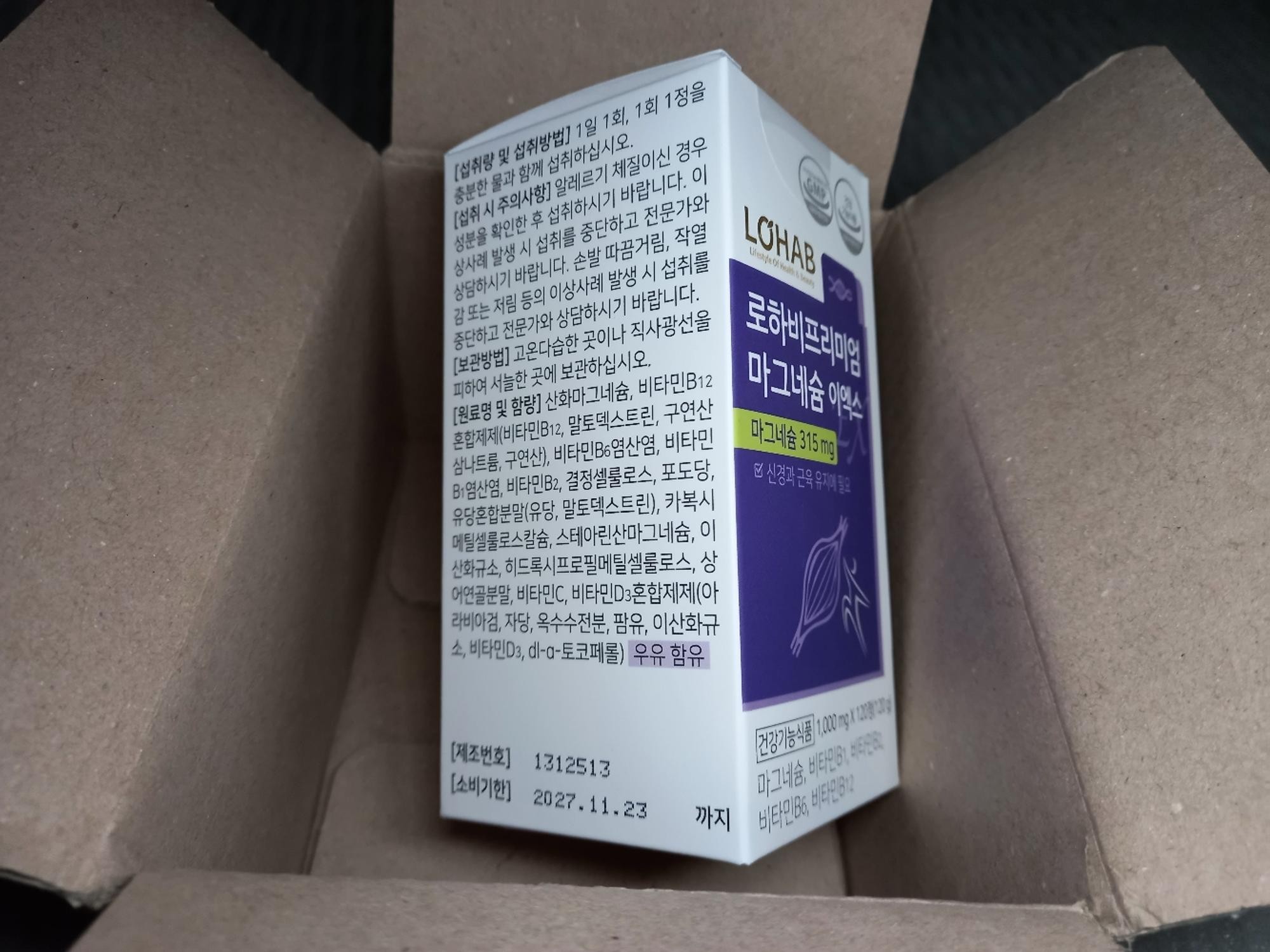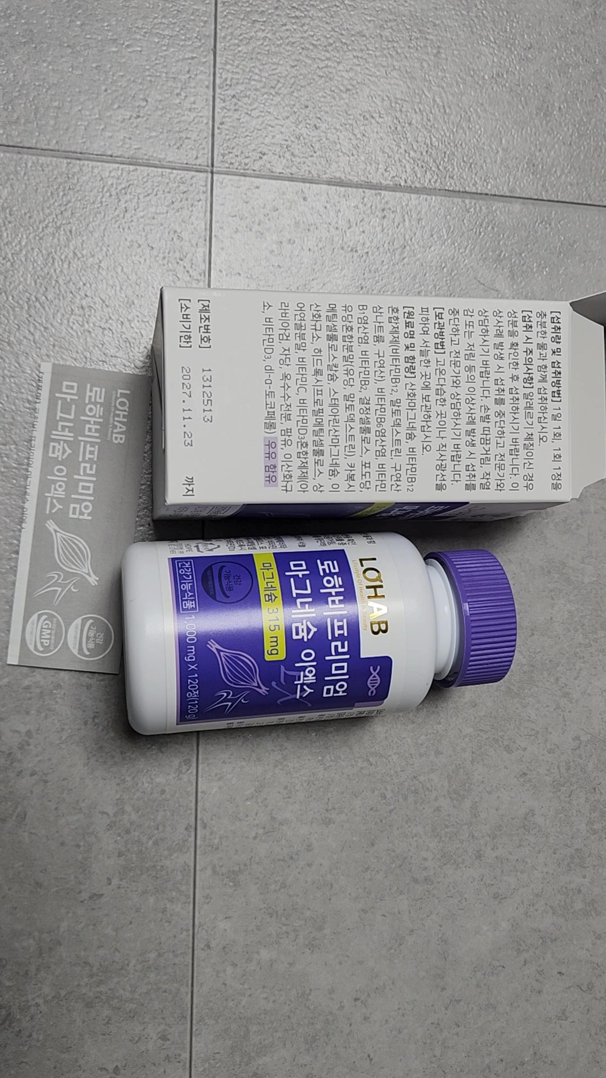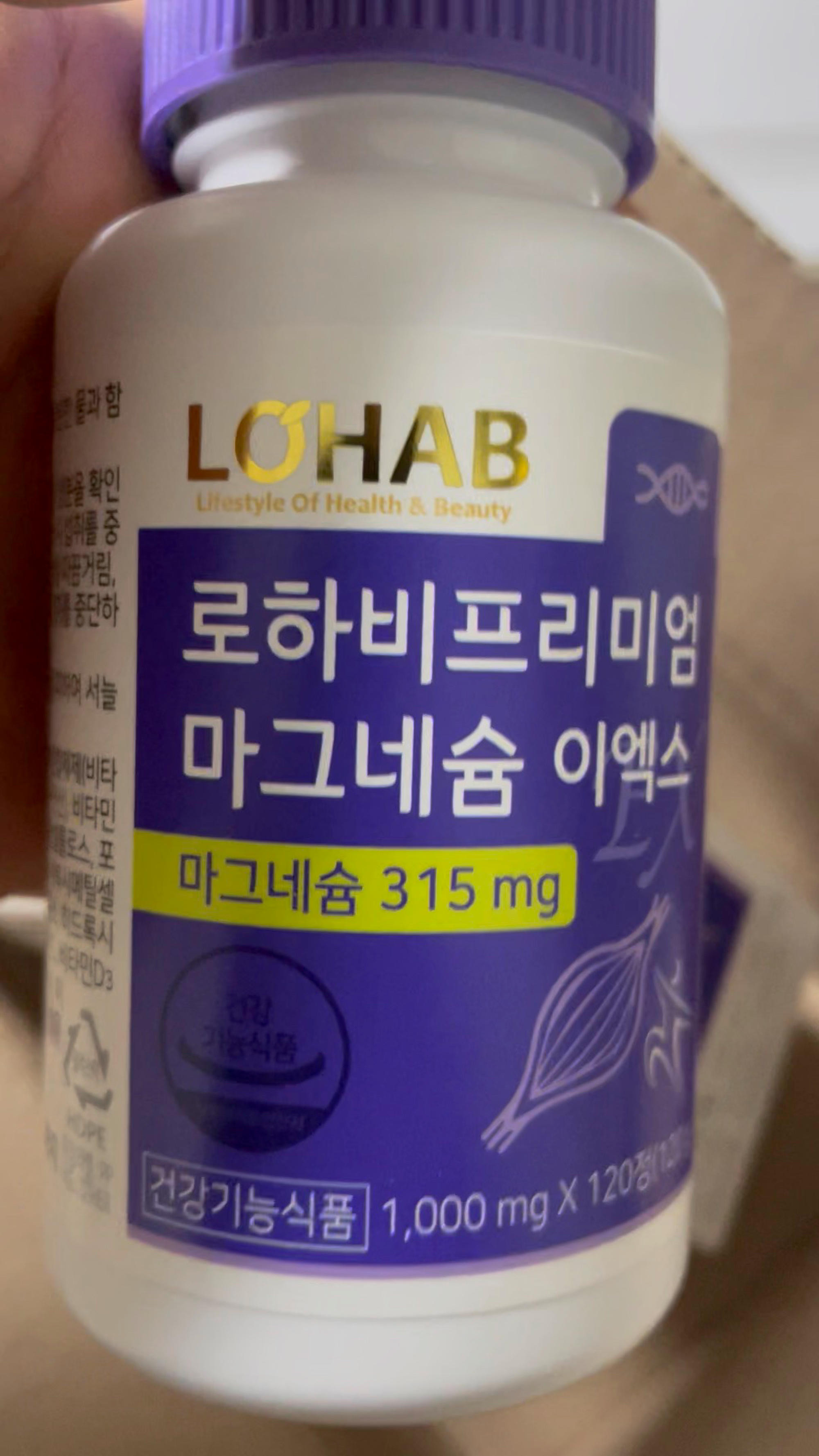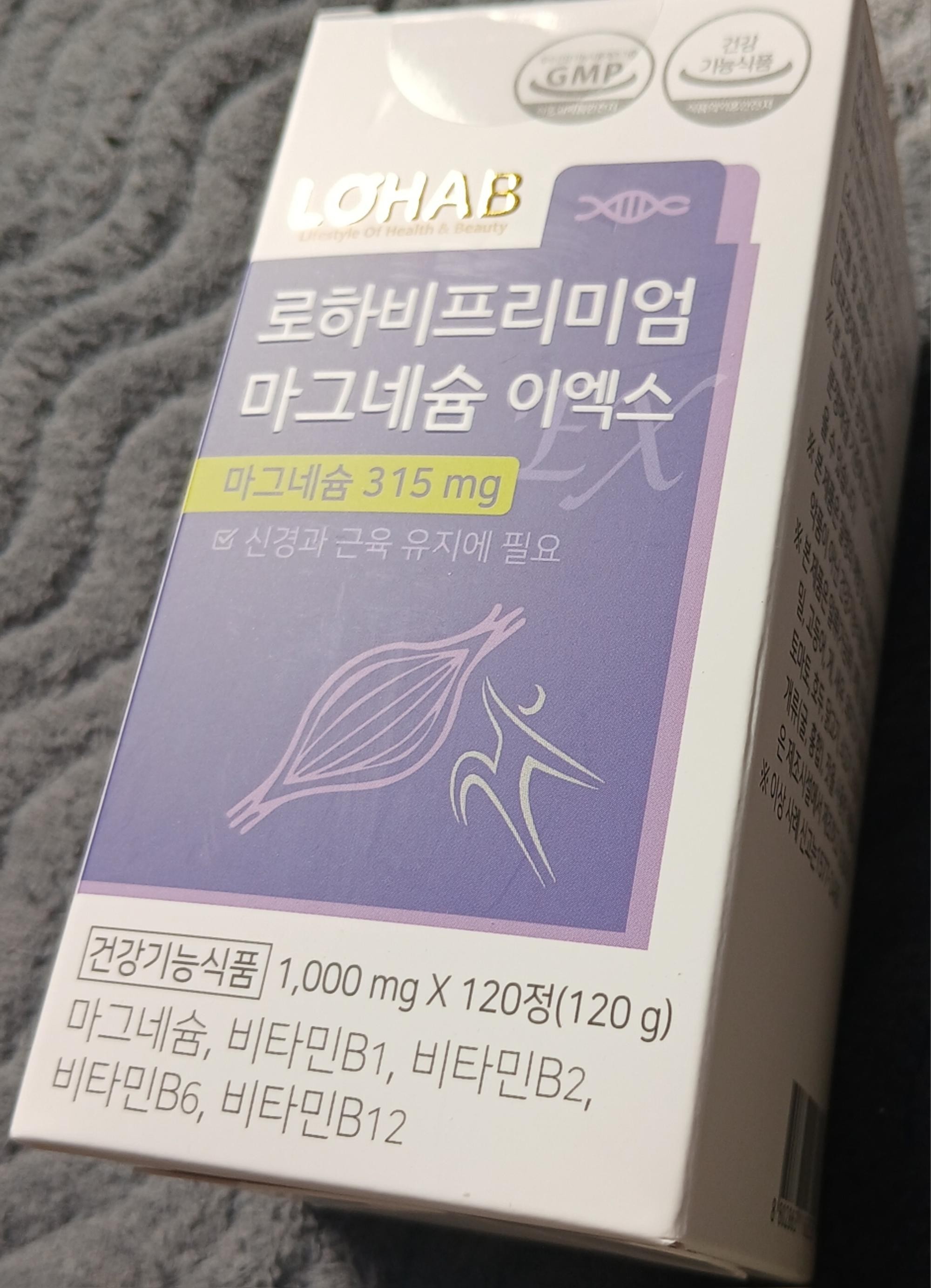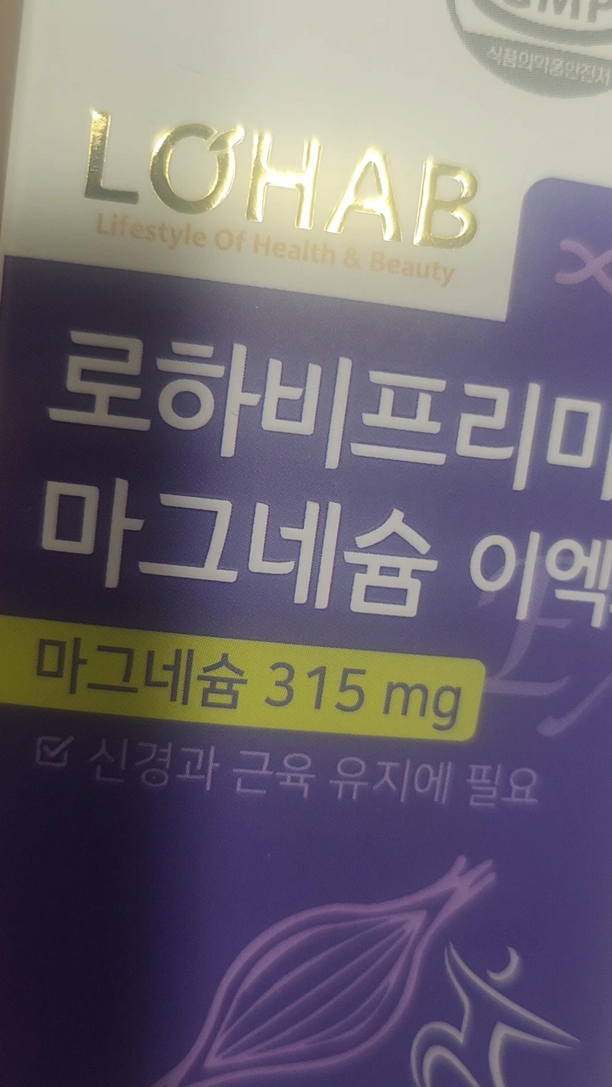 LOHAB 로하비 프리미엄 마그네슘 이엑스는 315 mg의 마그네슘이 들어있습니다. (건강기능식품) 신경과 근육 유지에 필요해서 구매했습니다