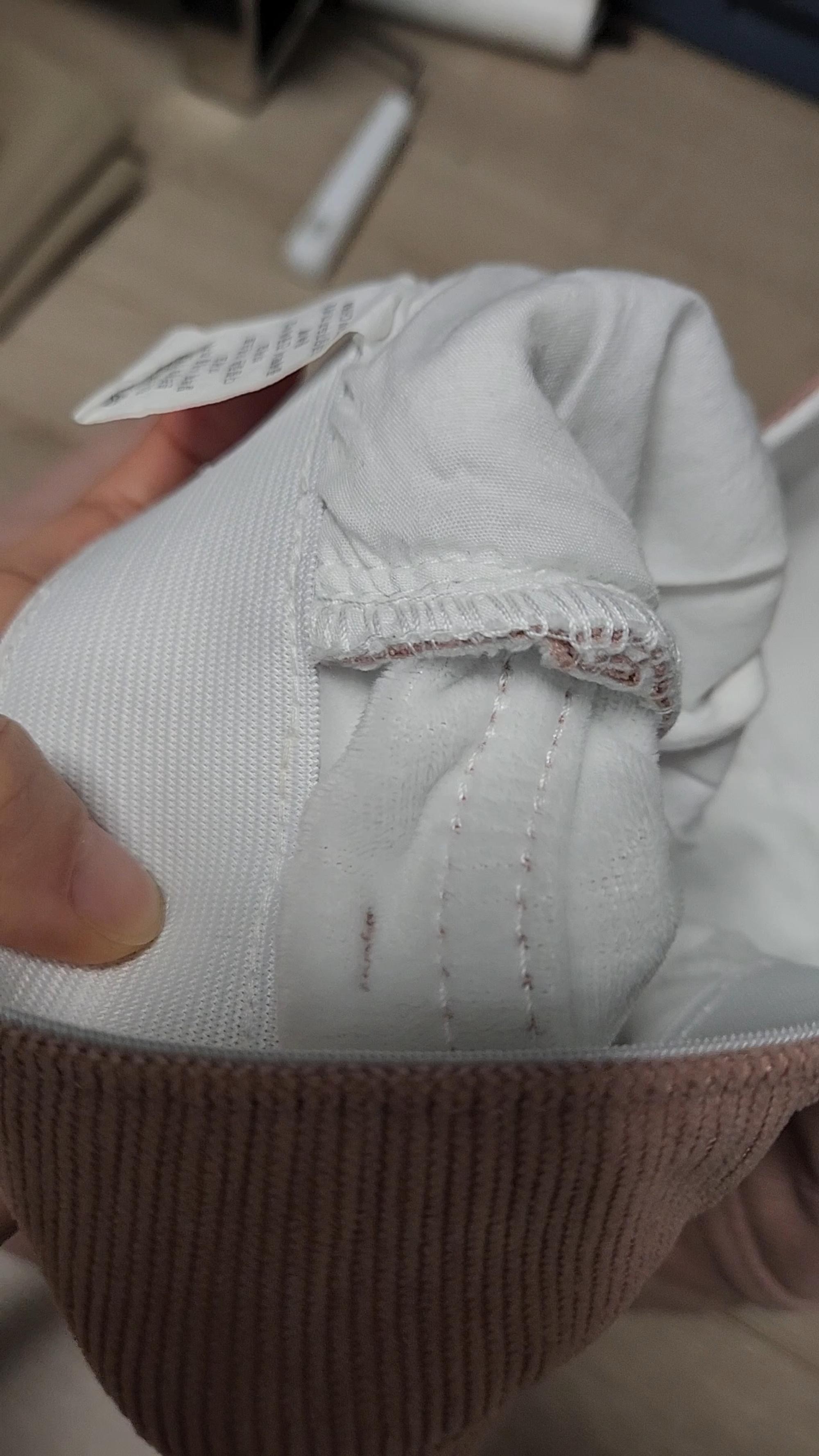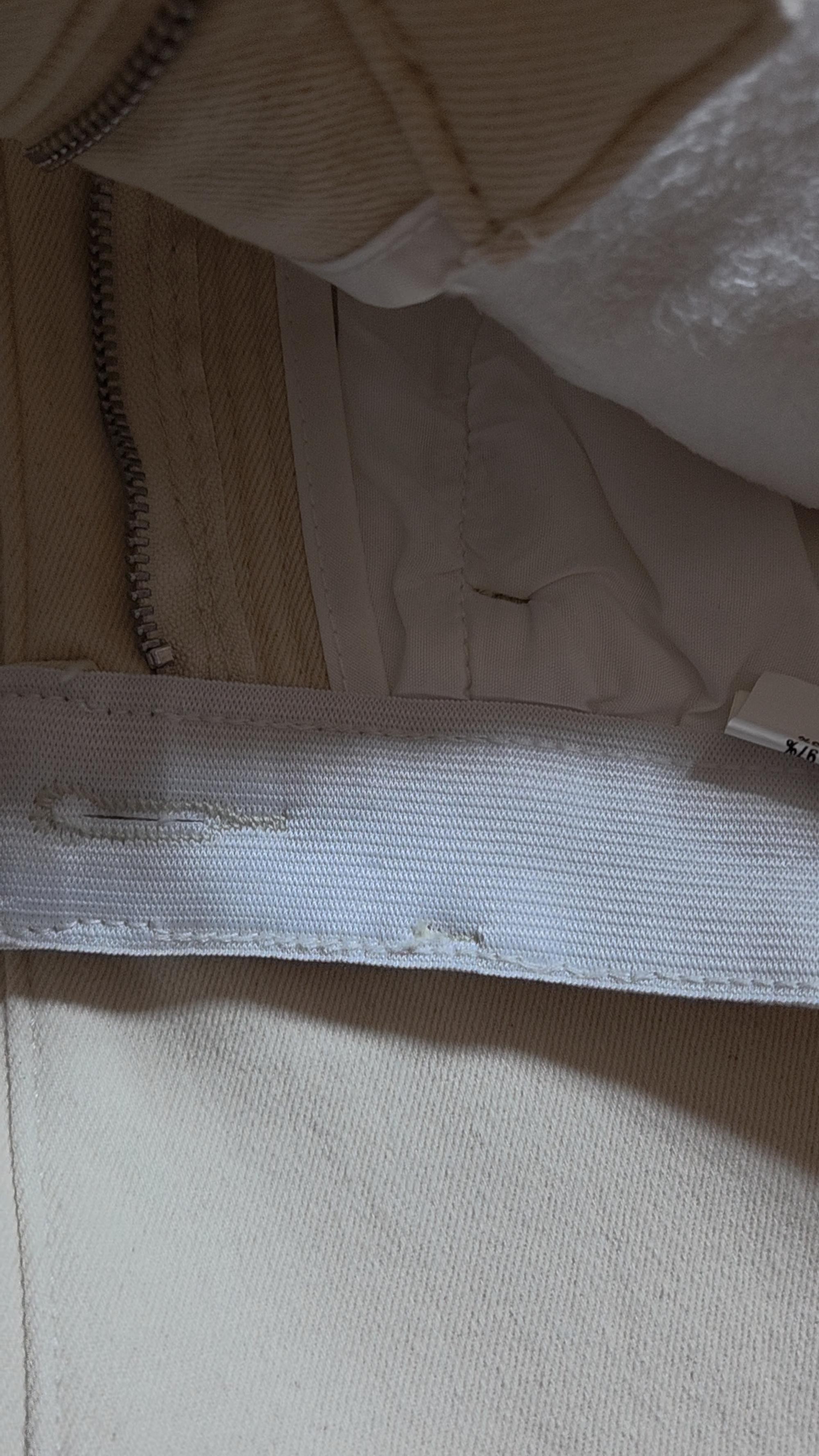 박음질대충해서 원단 올나가있고 지퍼부분 마감 대충해서 벌어져서 보여요 바늘을 앏은걸써서 재봉하시지