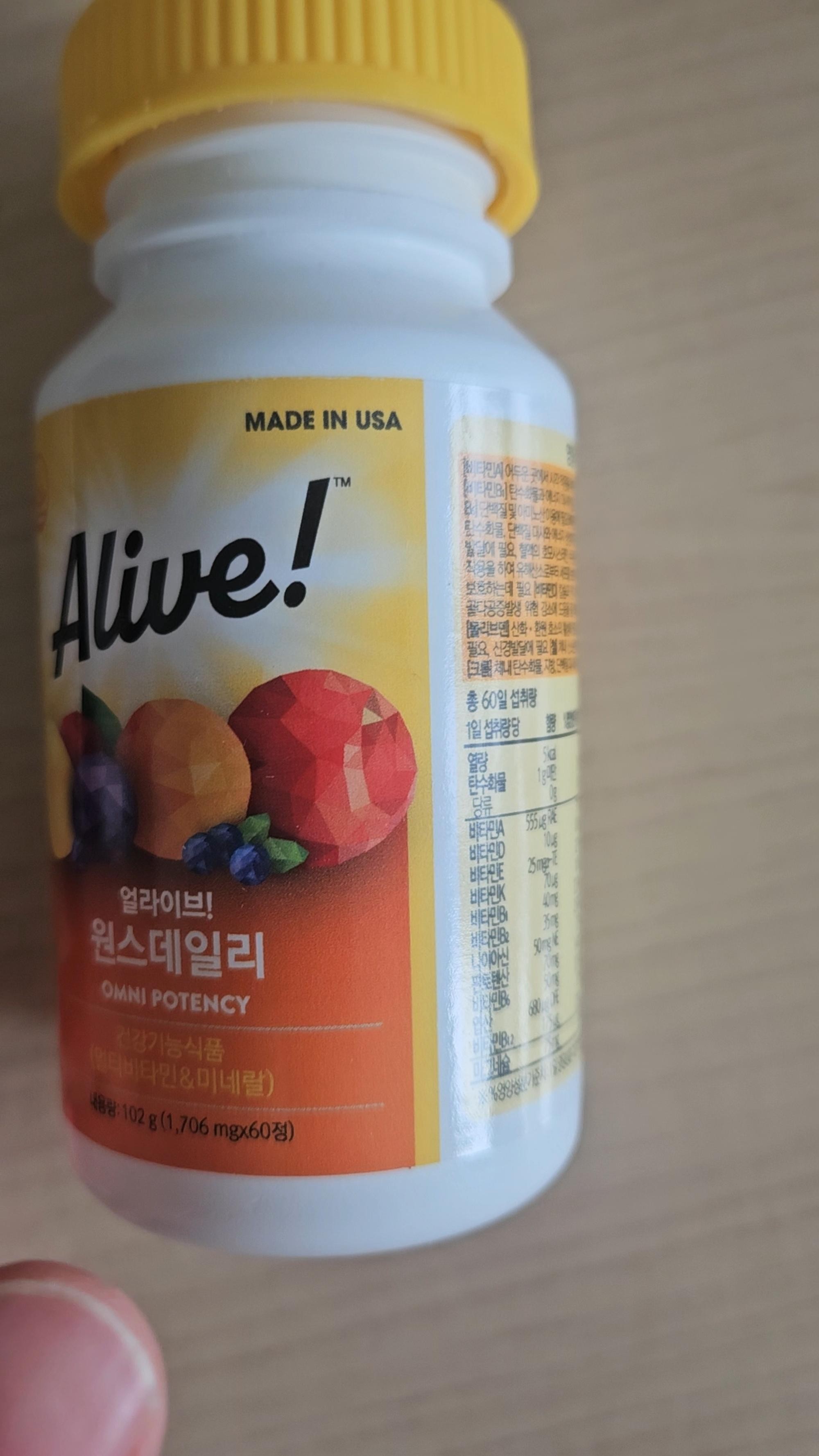 얼라이브 비타민이 좋다고하여 구매했습니다~ 알약이 생각보다 크기는한데 먹는데는 지장이없습니다ㅎㅎㅎ 꾸준히 챙겨먹어야지요~~