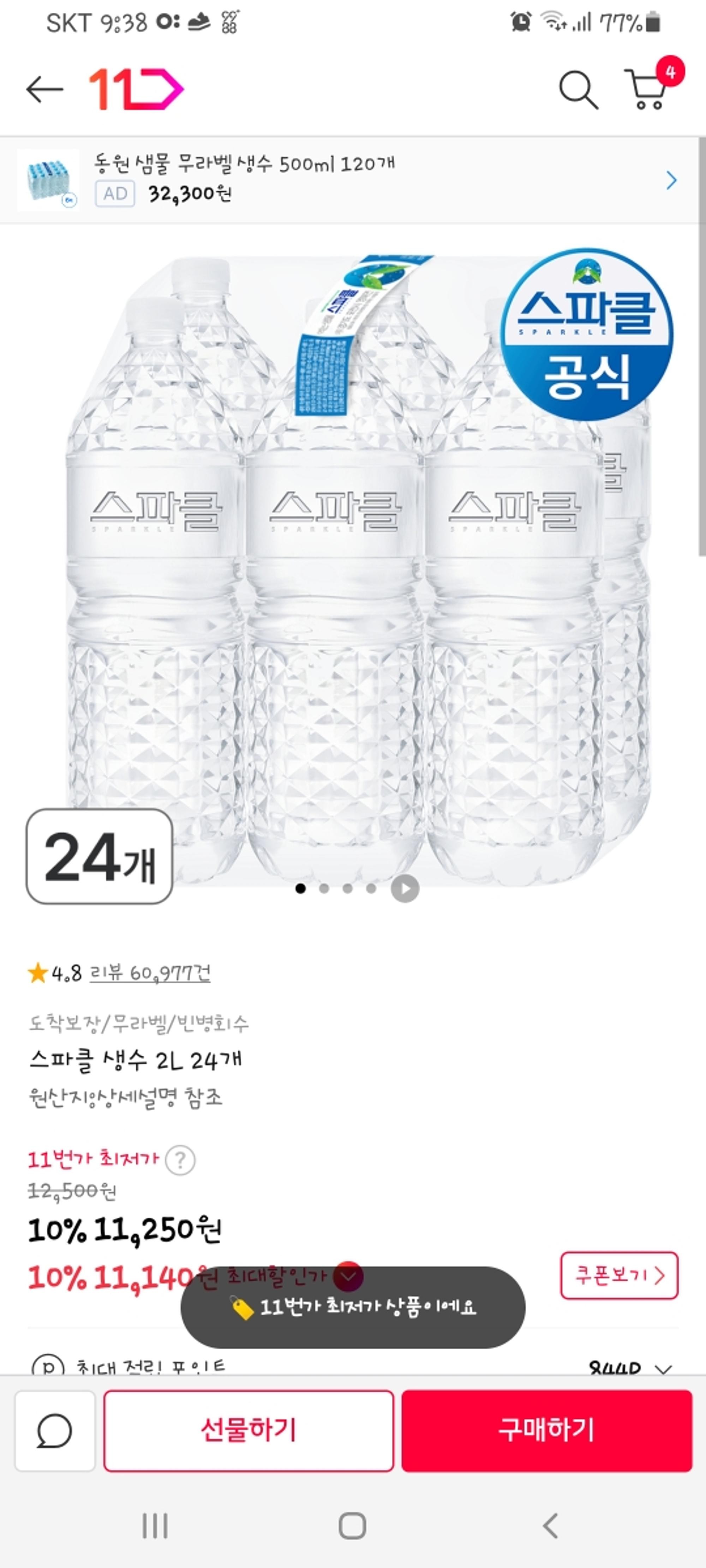 아들이 생수만 먹어서 항상 11번가에서 스파클로 주문완료 빨라서 좋고 포장도 깔끔하게 굿입니다.