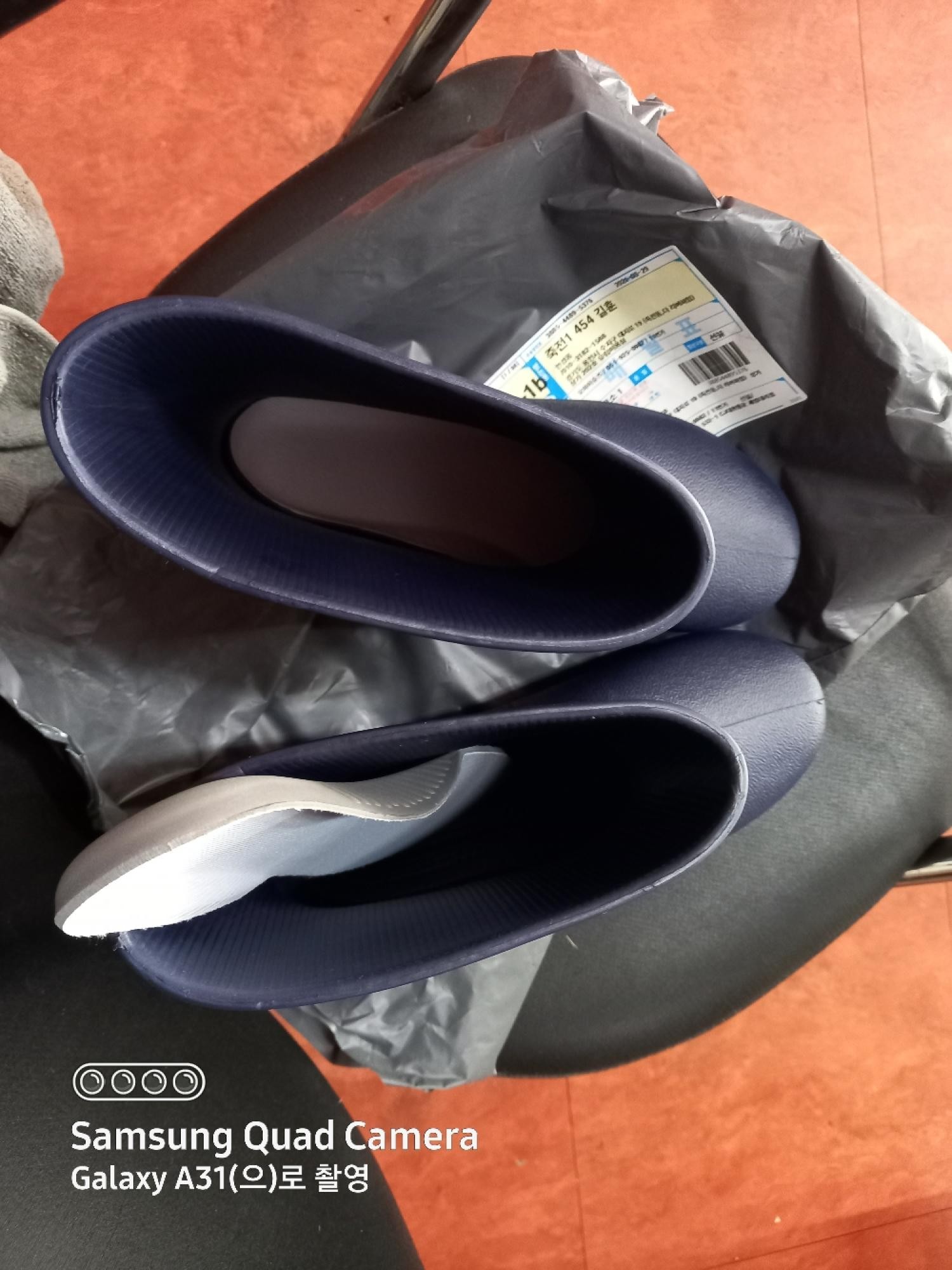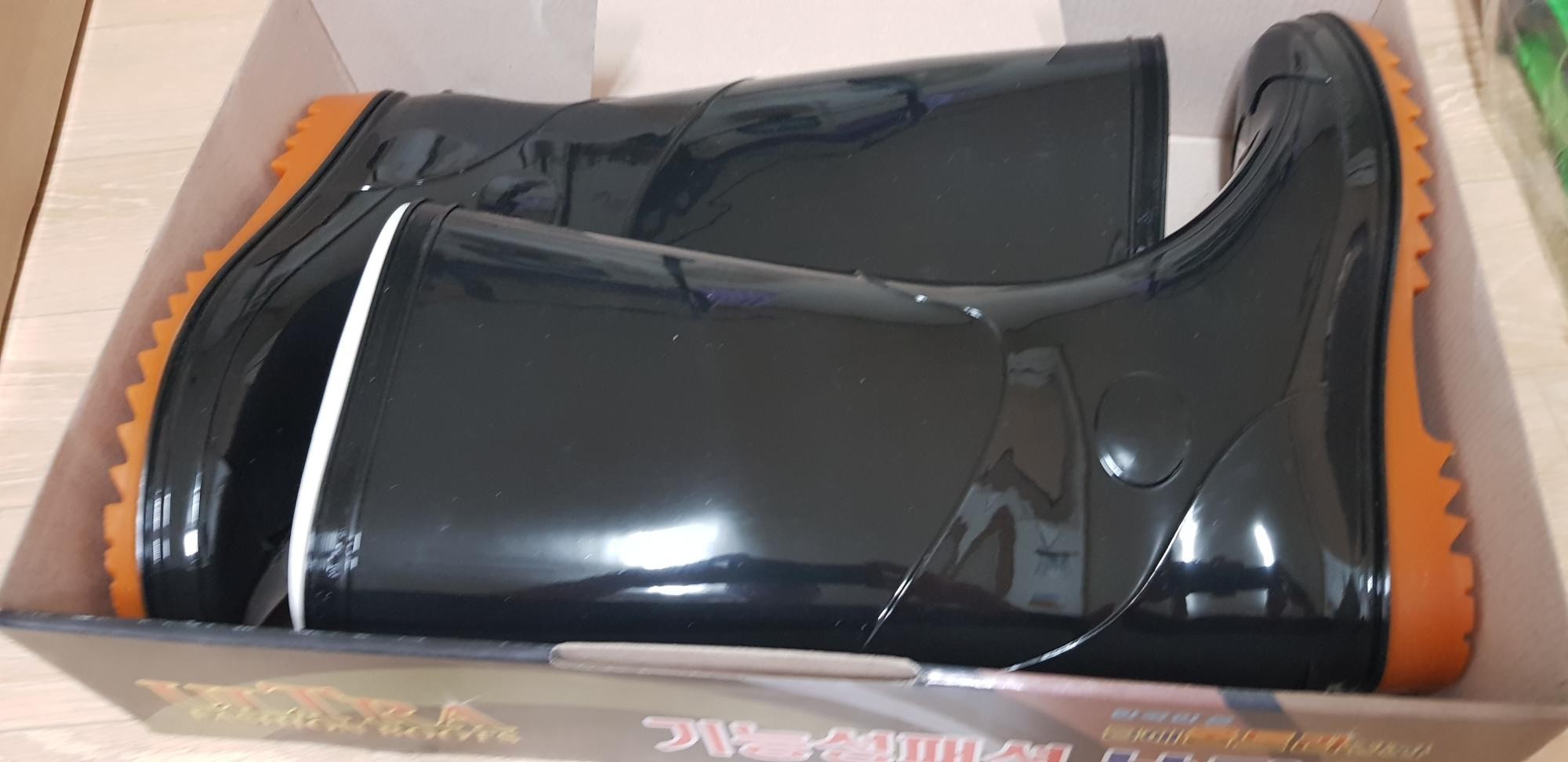 어제까지비왔었는데.이번에 배송이 쪼매 느렸어요.일할때 신을려고 주문합니다.비올때 장화만한게 없죠.가격 저렴하고 작용용으로적당합니다