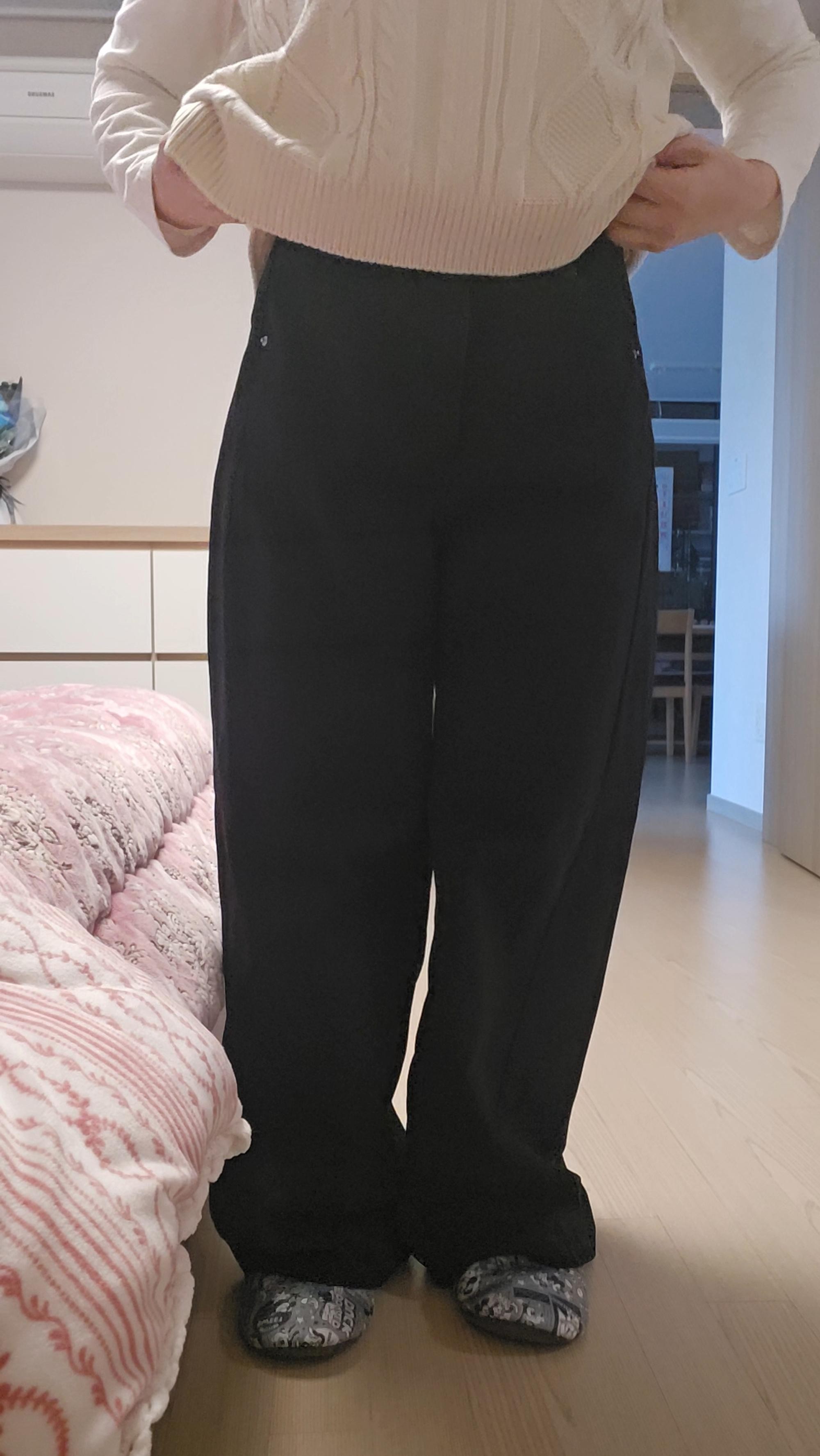 키가작은 저한테는 많이 길긴하지만 키높이 신으니까 얼추 괜찮네요. 신축성은 없지만 통이넓어 활동하기 편하고 블랙색상이라 어디에든 무난하게 어울릴것 같아요.