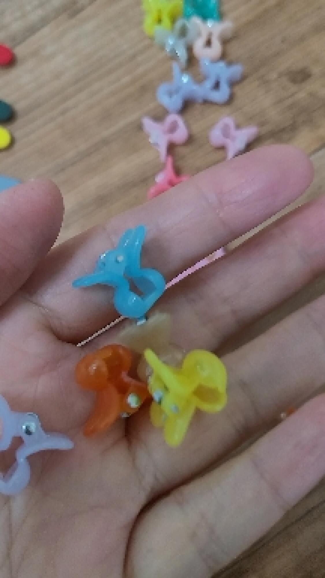 색상도 사진 그대로고 컬러감 좋아요. 단점이 있다면 아크릴은 자꾸 머리카락이 똑딱삔과 겉을 싼 플라스틱에 머리카락이 끼어서 아이가 혼자 뺄땐 좀 힘들어 하거나 머리카락이 뽑혀요 ㅜㅜ;;