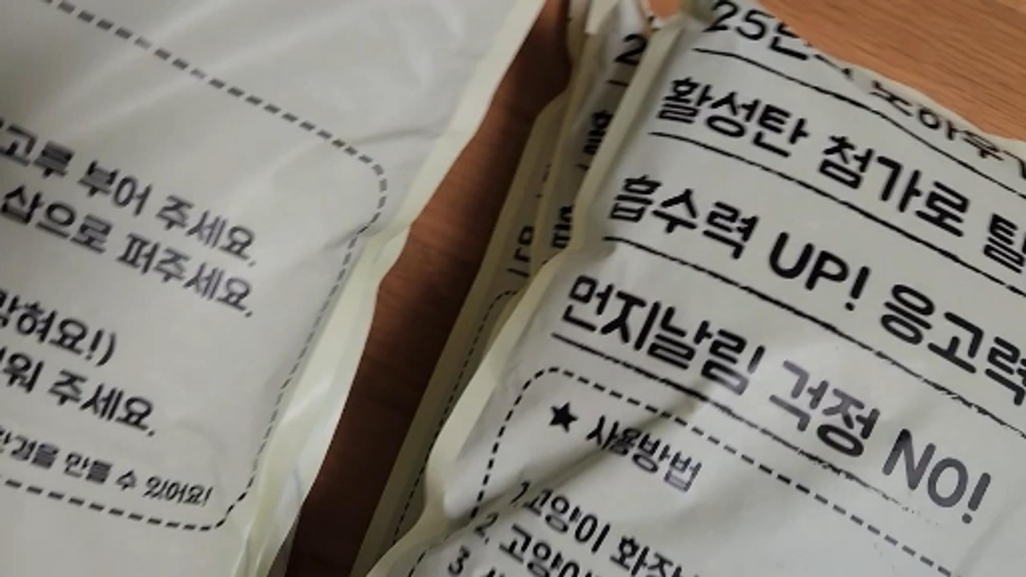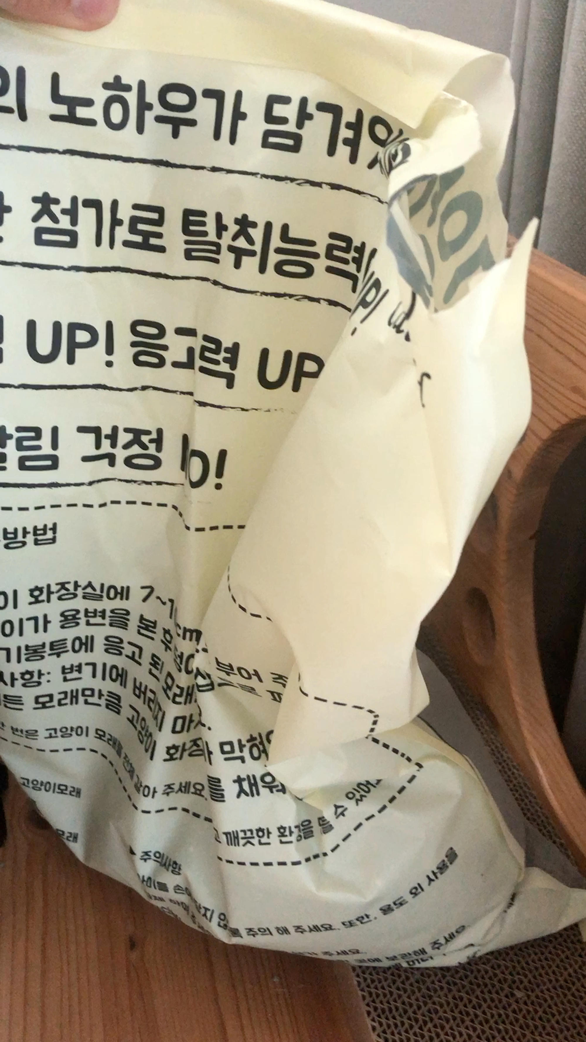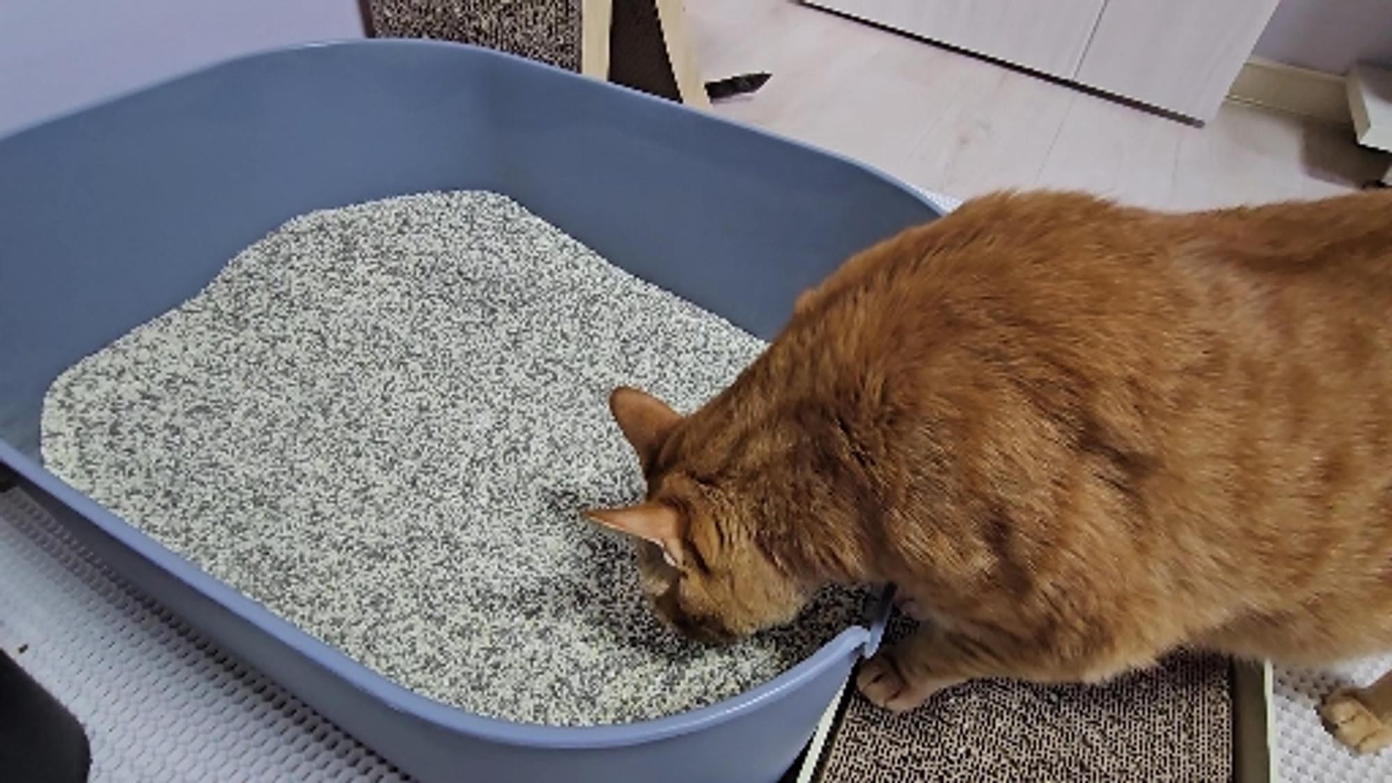 늘 사용하는 모래예요 울집양이들이 좋아하기도 하구요 이번에 보니 입자가 살짝 굵어진느낌이고. 검은색 알갱이도 보이네 항균작용하는거겠죠? 입자가. 굵어진만큼 모래 먼지는 줄어들것같아요