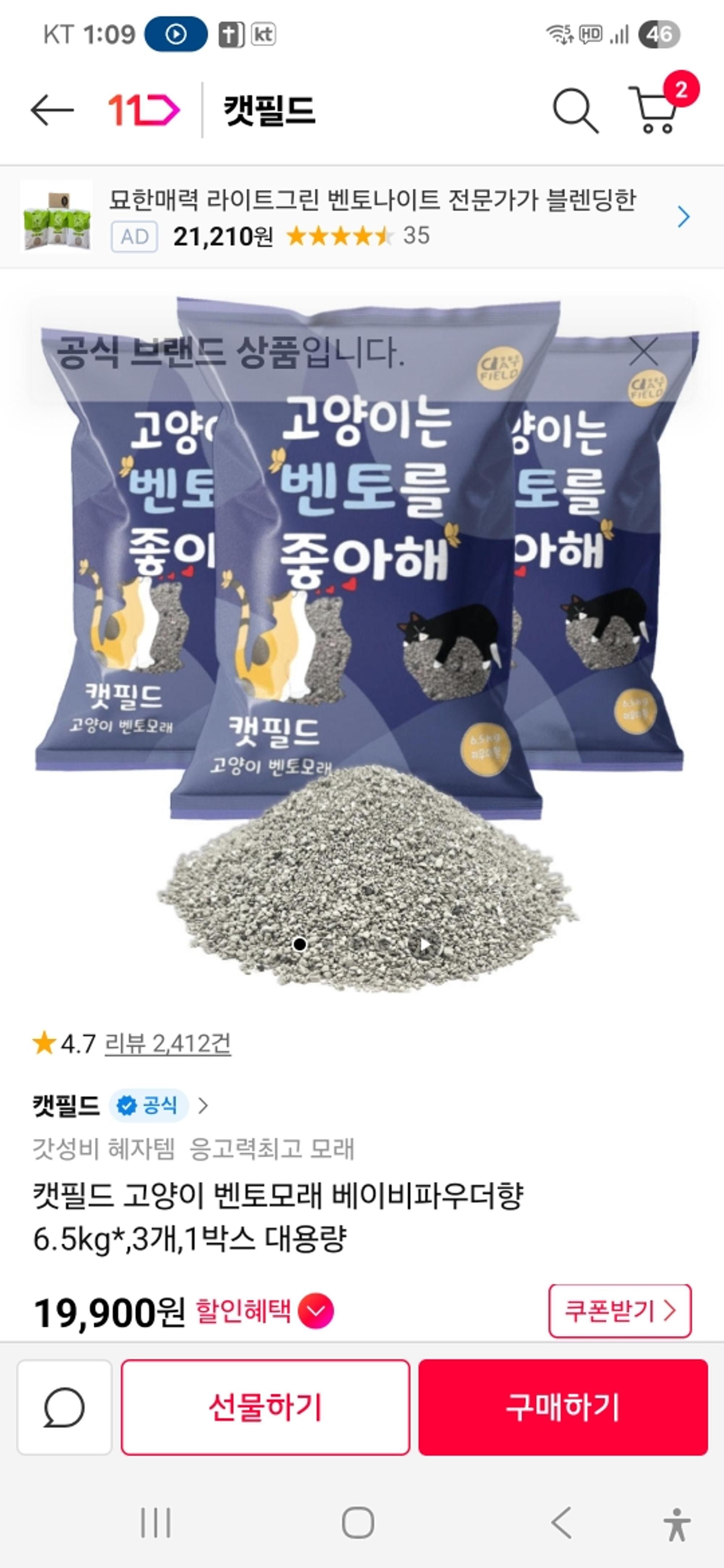 수입모래가 가격이 너무나 많이 올라서 최근에는 계속 이 캣필드 모래를 사용하고 있습니다. 저렴해서 만족합니다