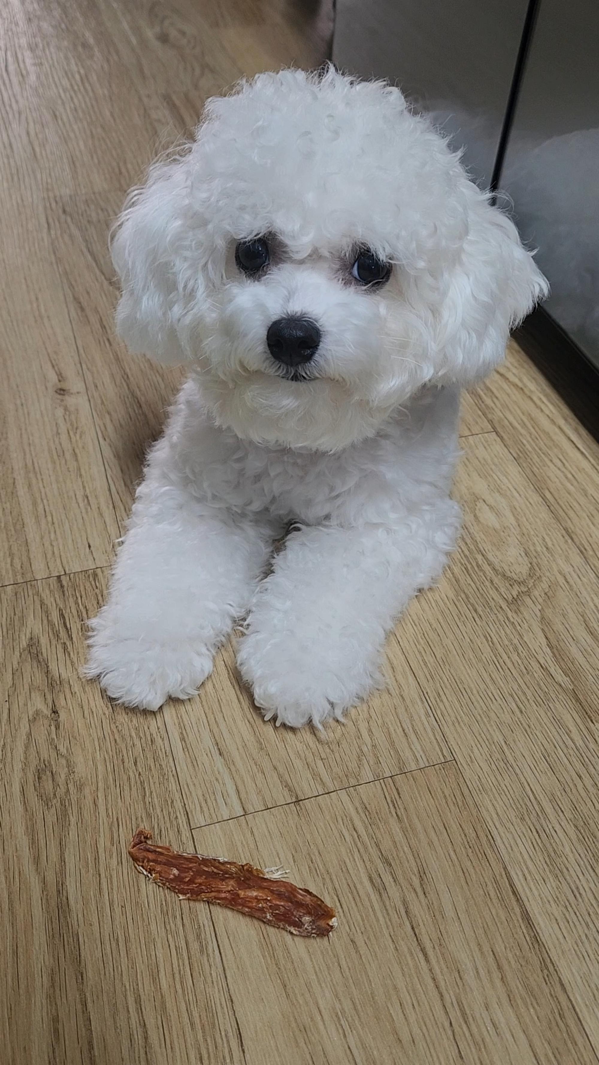 5.6kg 말티푸 생각보다 빨리 먹네요. 뼈가 씹기 적당한가봐요. 잘 먹네요.