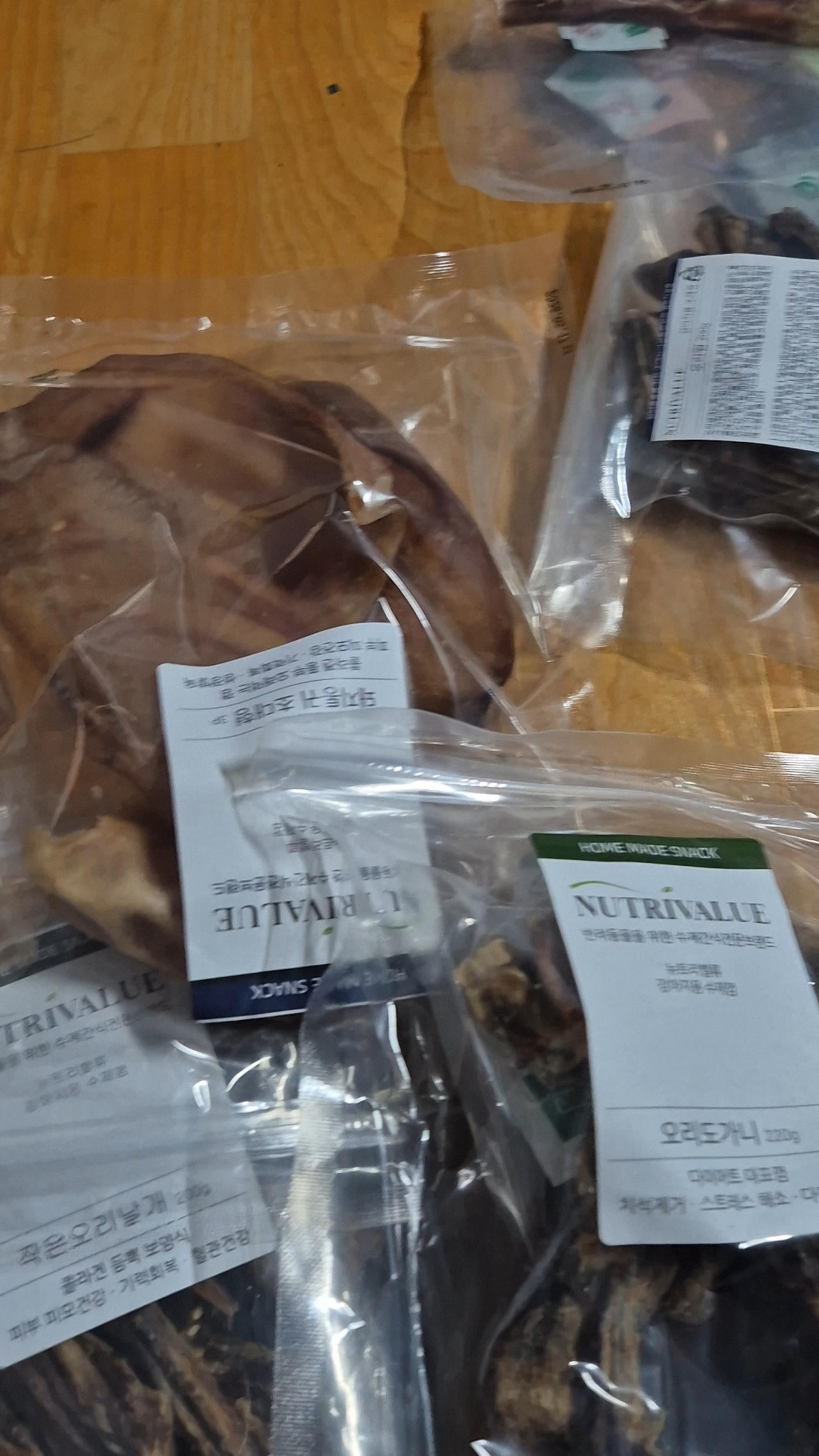 돼지귀를 잘먹어서 수제간식 찾다가 주문했어요. 누린내도 안나고 좋아요. 딱딱한걸 좋아하는 강아지에겐 좋은거 같아요. 우족도 오리작은날개도 잘먹네요.^^다음에도 주문할게요.