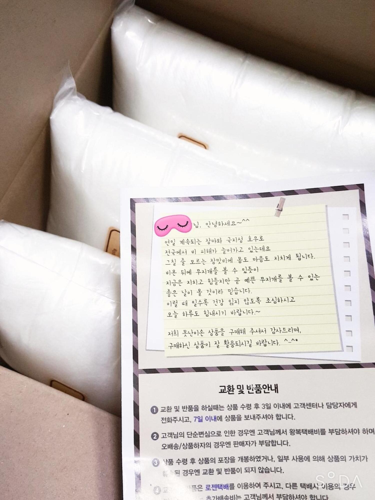 택배를 지금 풀어서 봤네요^^;ㅎ 솜 3개밖에 주문 못했는데도 (3300원정도ㅜ) 이렇게 친절한 글이 들어있어서 감동했어요ㅎㅎ 글을 참 잘쓰셨네요~ 솜 제품들도 몽글몽글 많이쓸수 있을것같아요 담에도 자주 이용할께요☆