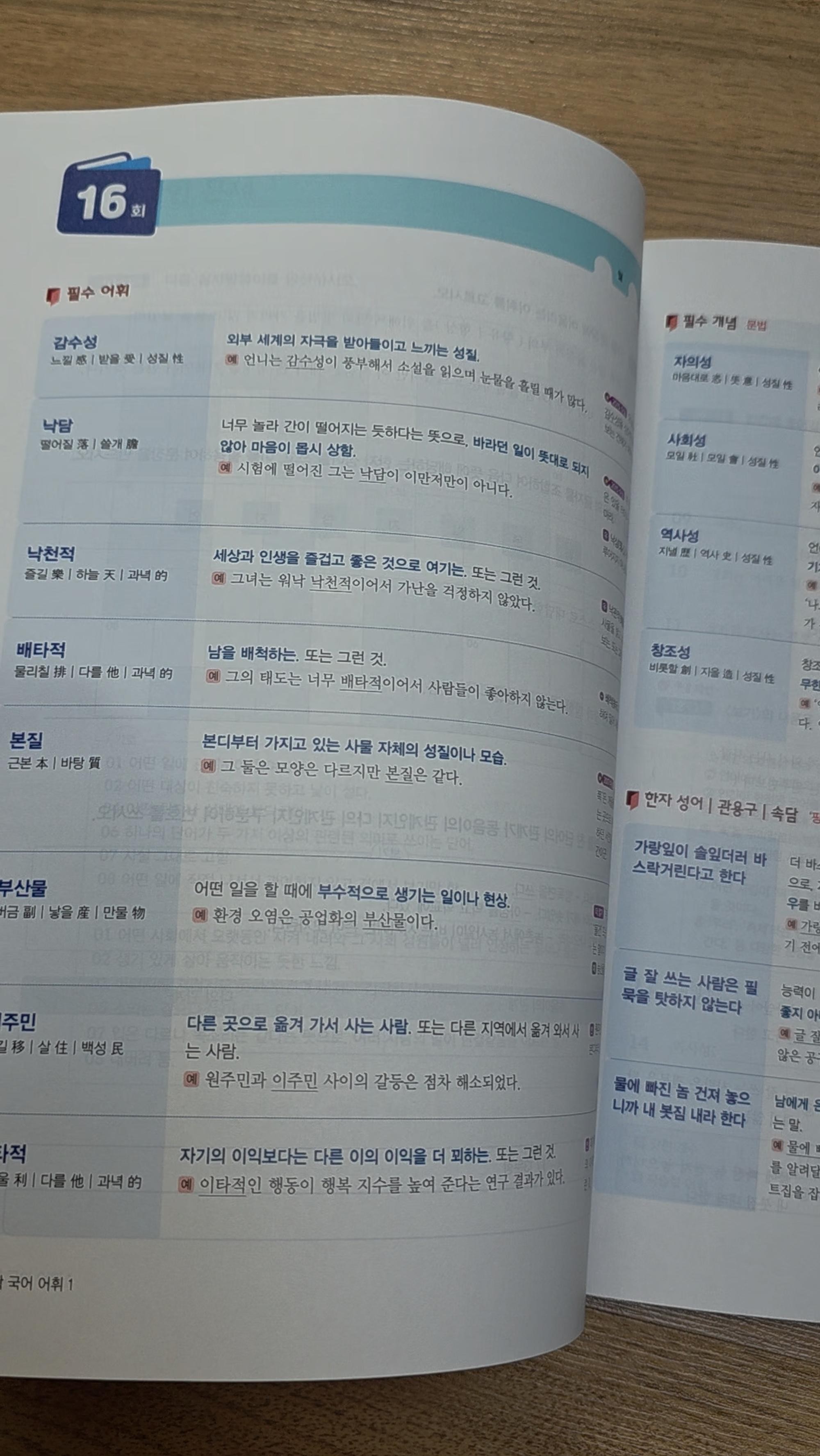 매 회차별로15개의 필수 어휘, 필수 개념, 한자성어, 관용구, 속담을 익힐 수 있도록 구성되어 있고