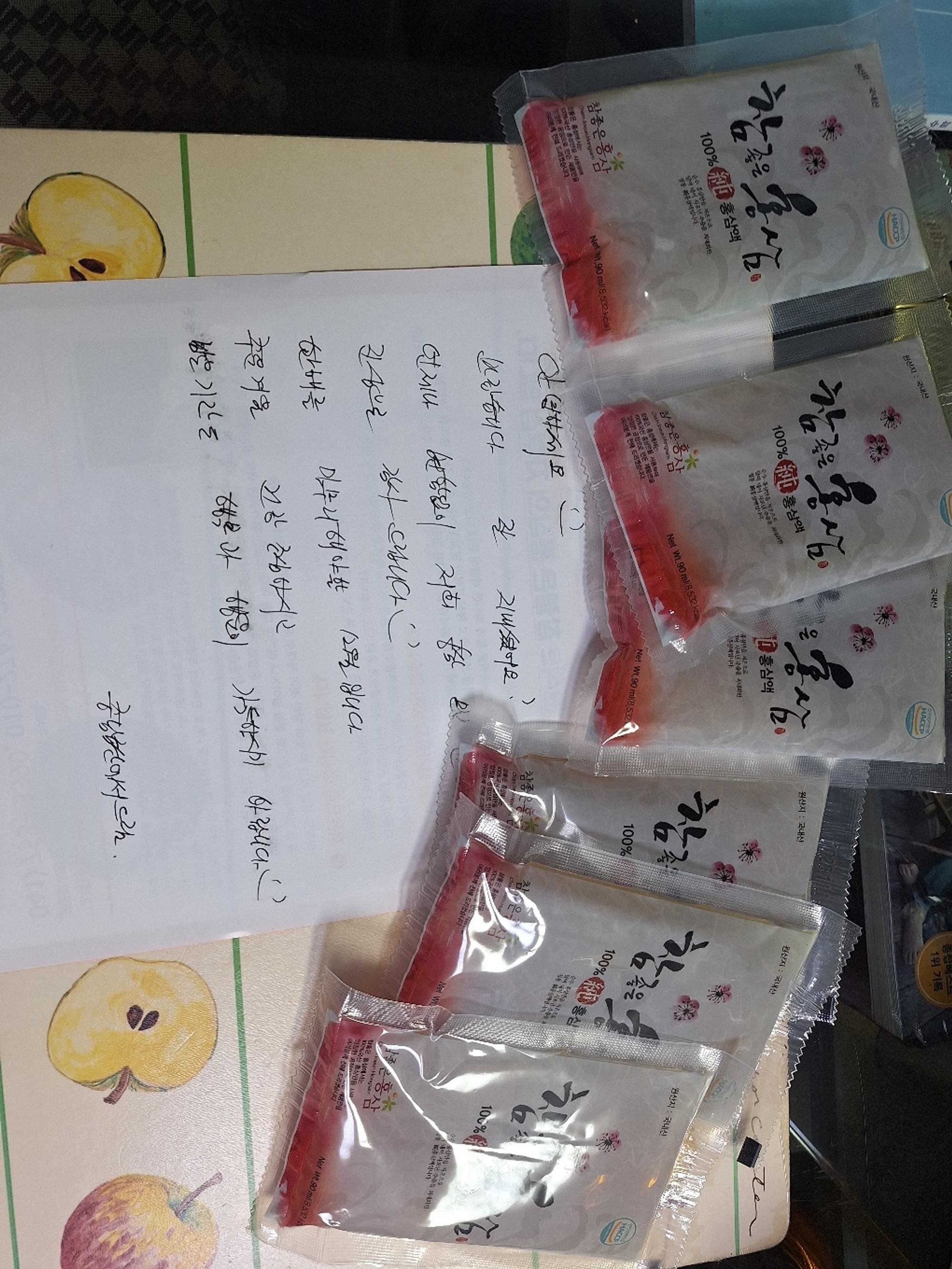 늘 정성스럽게 만드시고 편지도 써주시고 사은품으로 본품도 더 주셔서 너무 감사해요~ 만드시는 분들도 건강하세요~ 홍삼은 여기 걸로만 먹은지 좀 됐어요~!!