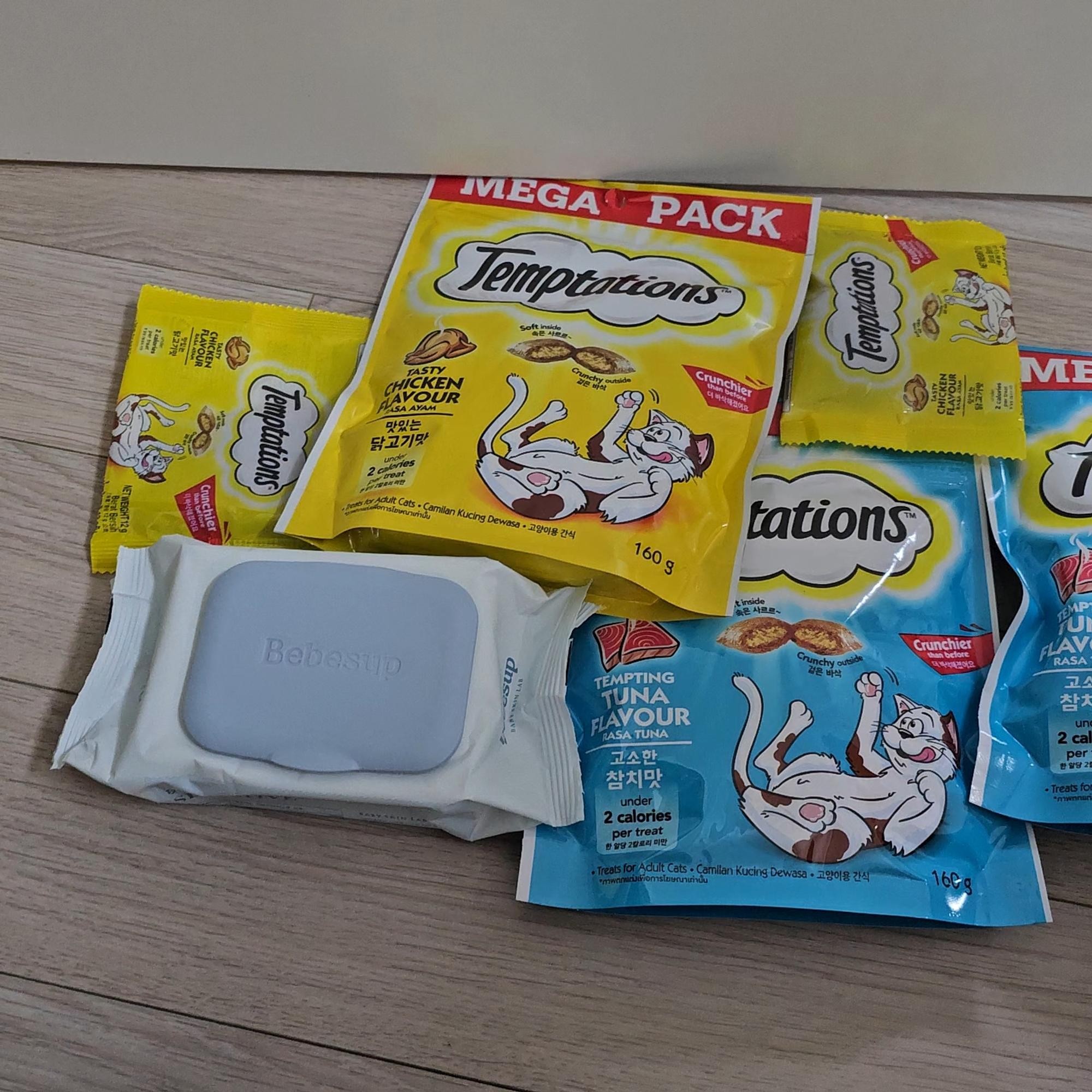 템테이션 대용량 5개 골라담기+쉬바캔+고양이낚시대+베베숲물티슈1팩. 배송도 빠르고 유통기한도 넉넉 하내요 맛도최고입니다 적극 추천 드립니다 또구매할께요ㅋㅋ.