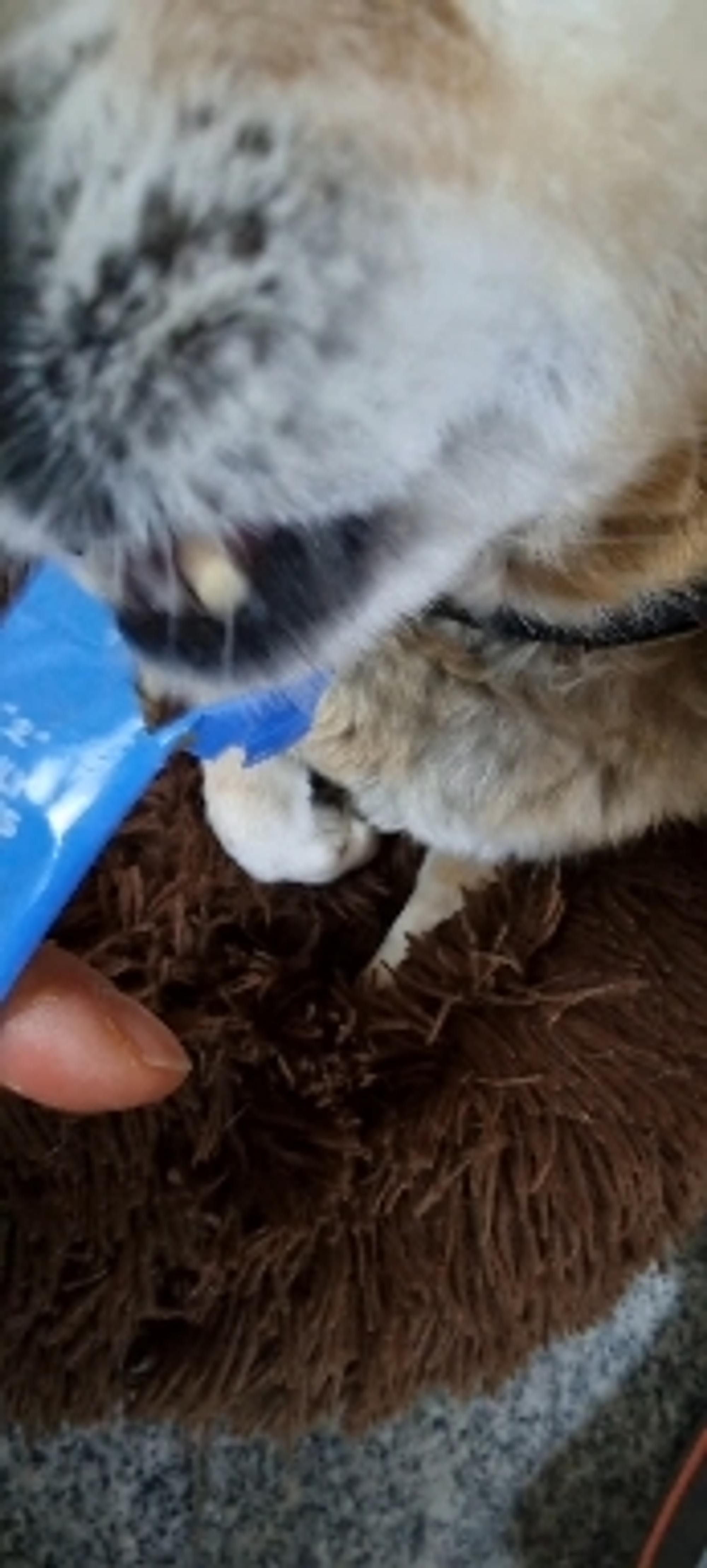 성분이 효과가 있다고 해서 구입, 아직은 명확한 결과를 내리기 어려워서 6개월 정도 먹이고 관찰할 예정임. 작은 스푼으로 포장 안쪽을 긁어내야지 그냥 짜서는 내용물이 포장지에 묻어서 안나옴,  그릇에 담아주면 순삭하고 더 달라고 쳐다보는 모습을 찍어서 올림