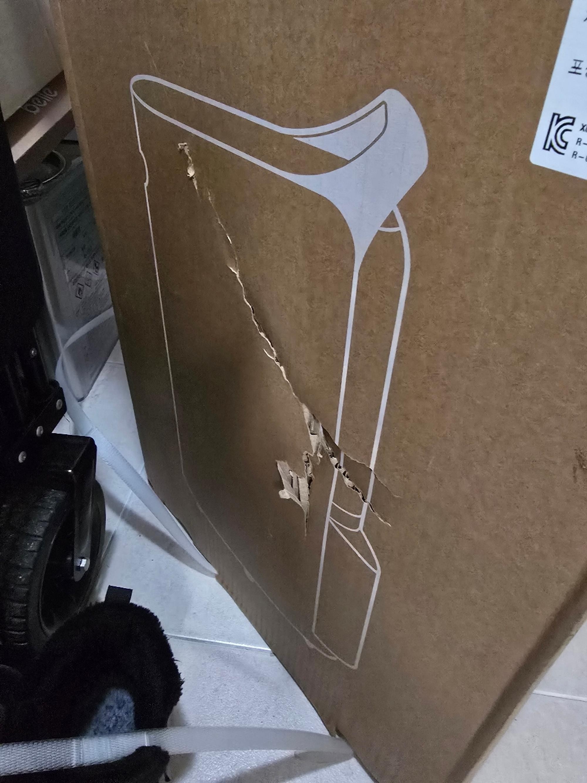 제품 배송 된 상태인데 박스 옆 지름 30센지 구멍이랑 뒷면 아래 작은 구멍과 제품에 찍힘 현상 선명합니다.