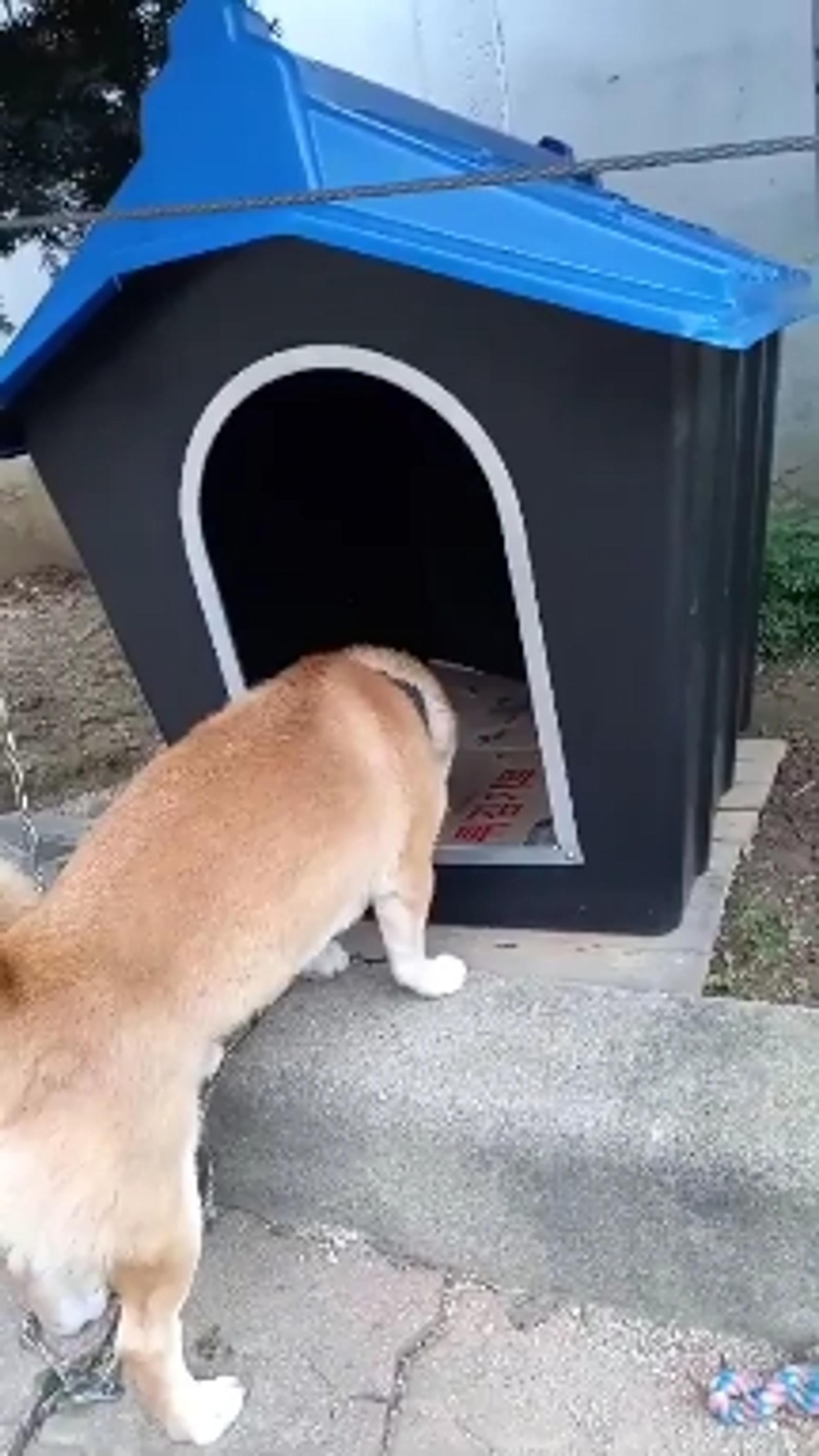 개가 개집을 보니 약간 경계하고