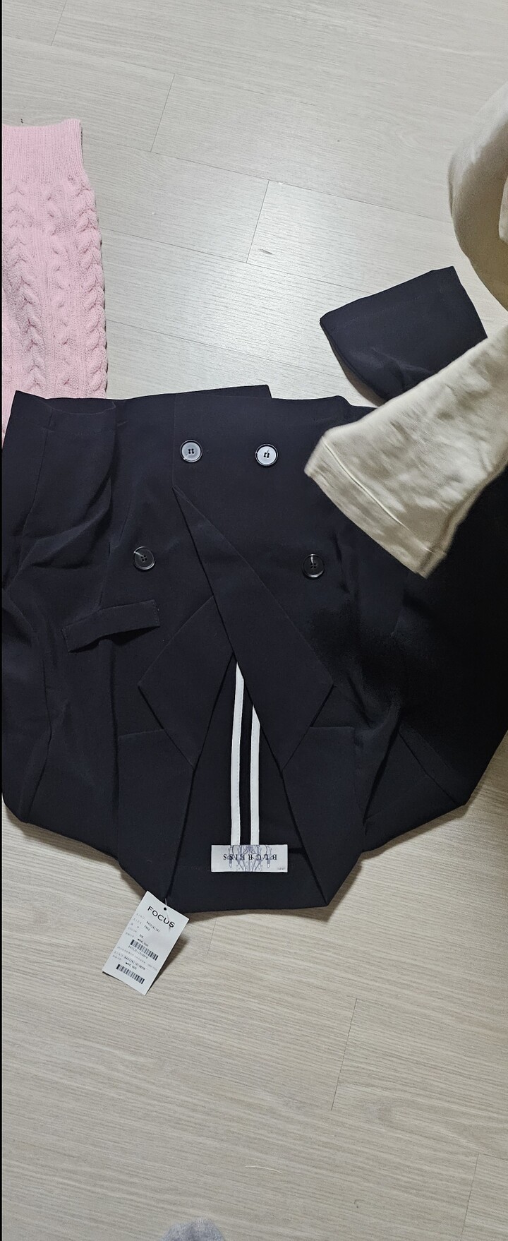 라인 이쁘게 떨어지는건 만족이구요 겉과 달리 안쪽 원단이 차가운 소재인데 몸에 닿는 감촉이 좋지 않아요 뜯자마자 올이 풀려 딸려 나왔는지 실밥 10센치 정도가 길게 풀려 있었으나 검정이라 표가 잘 나지 않고 번거롭게 교환할 시간적 여유도 없어서 그냥 라이터 불로 지져서 대충 입었네요