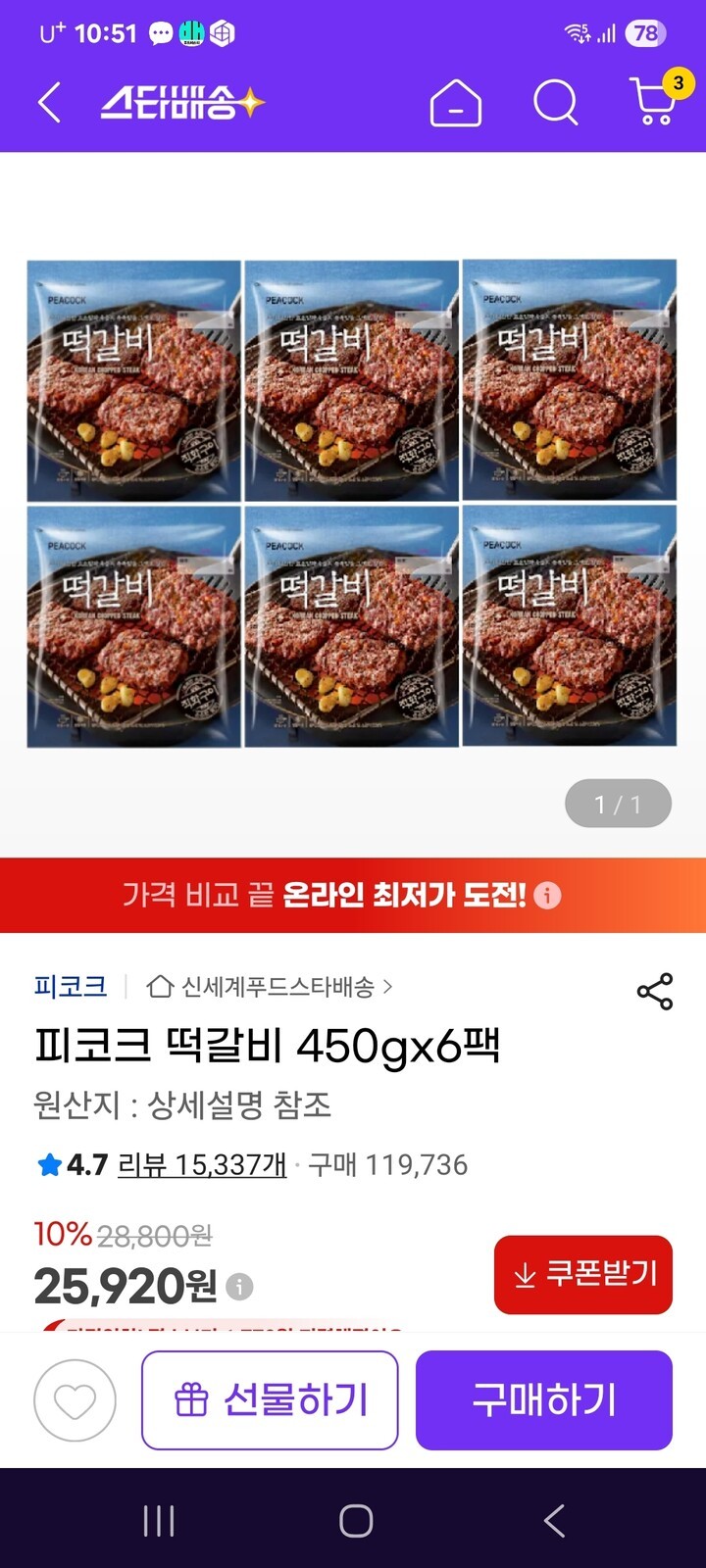 이마트갈때 피코크떡갈비 자주 사다먹었는데 가격이 많이 비싸다생각했었거든요.근데 6봉 묶음으로 주문하니 저렴해서 구매합니다. .맛이야 뭐 신세계니까. .믿고 먹어요.