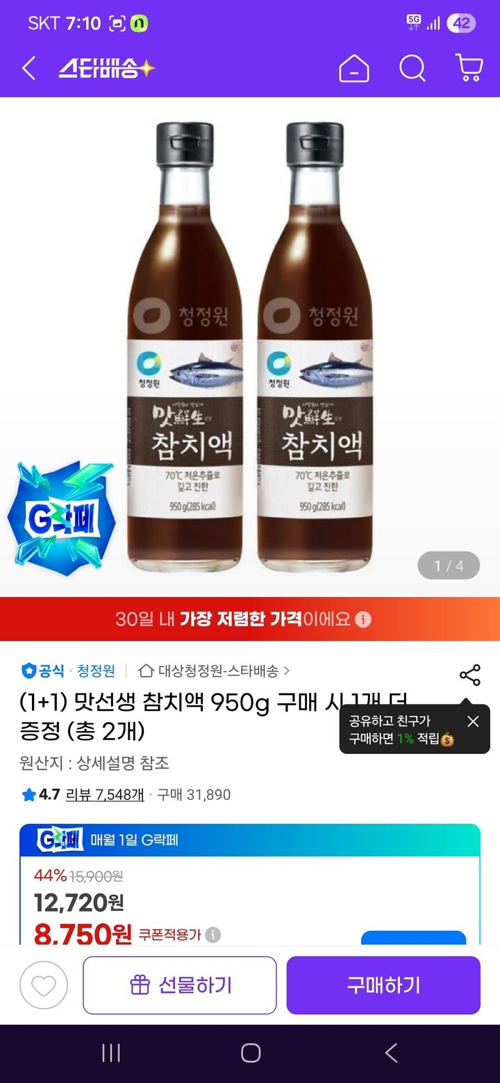 판매처 청정원 평점 4.7점 리뷰 7,656개