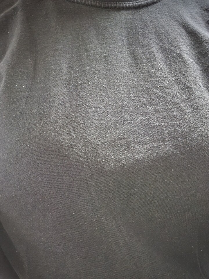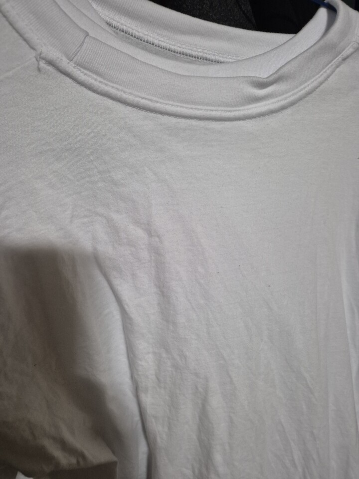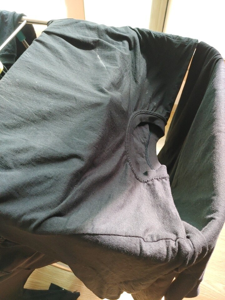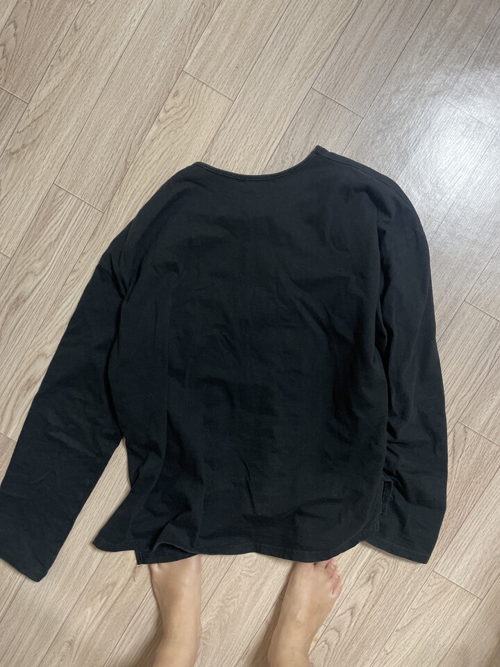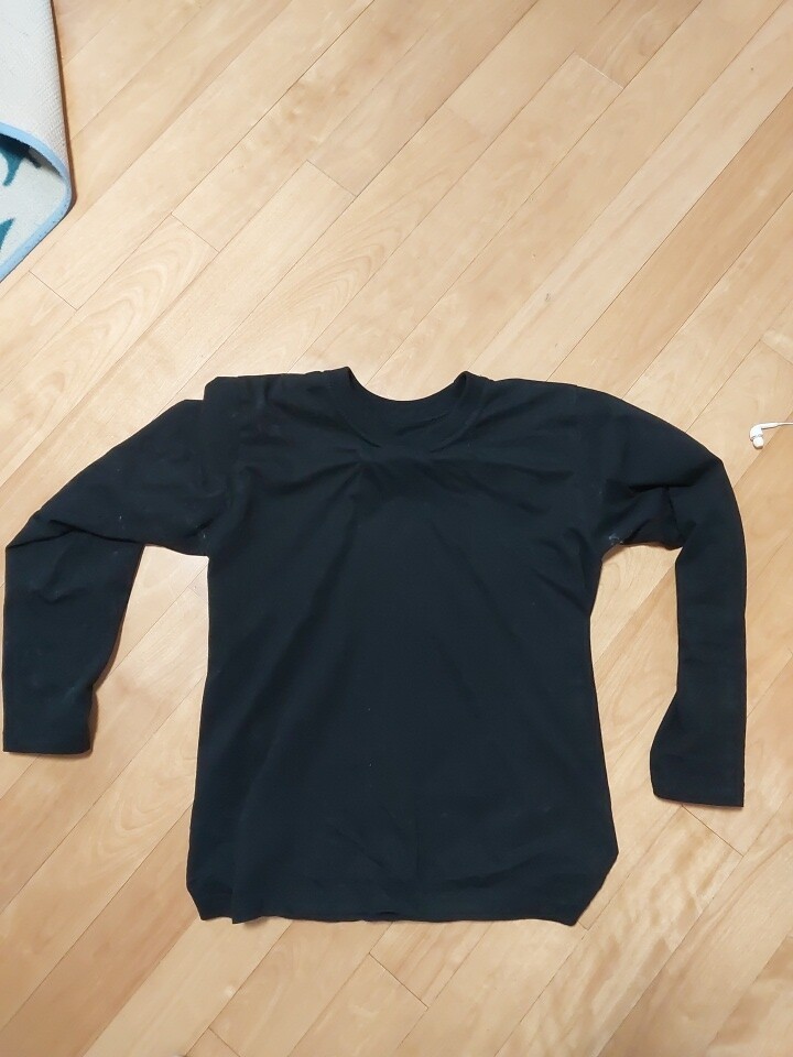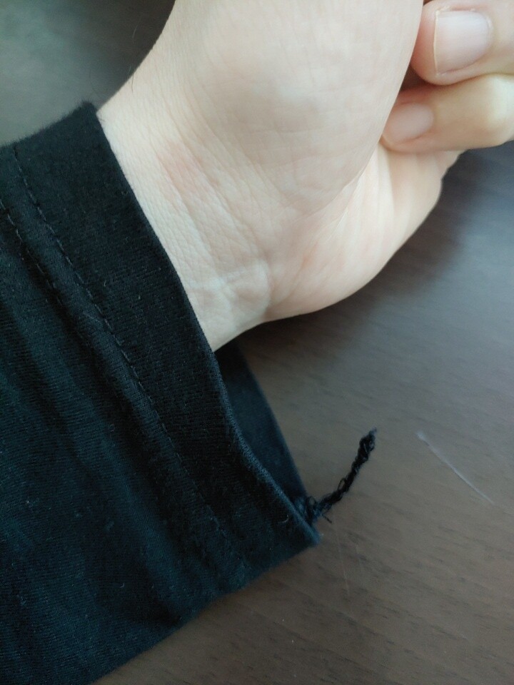 목이 갑갑해요 짝은게 아니라 구조가 일그러진느낌 일부러 늘려서 입어야 하고. 소매 양쪽이 사진처럼 실이... 뒤집으면 겨드랑이엔 저런식으로 엄청길게 붙어 있어요. 살면서ㅠ이런 마감 처리 처음봄
